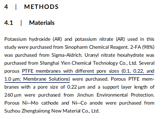 該研究成功構建了基于堿性水電解(AWE)-滲透膜蒸餾(OMD)耦合技術的系統,實現了有機溶液430倍高效濃縮,且無需額外能耗。其中核心分離環節中使用了邁博瑞疏水PTFE膜。