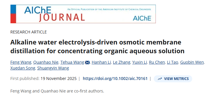 近日,湖南大學生命交叉研究院在化工領域頂級期刊 AIChE Journal 上發表了題為 “Alkaline water electrolysis-driven osmotic membrane distillation for concentrating organic aqueous solution” 的研究論文。
