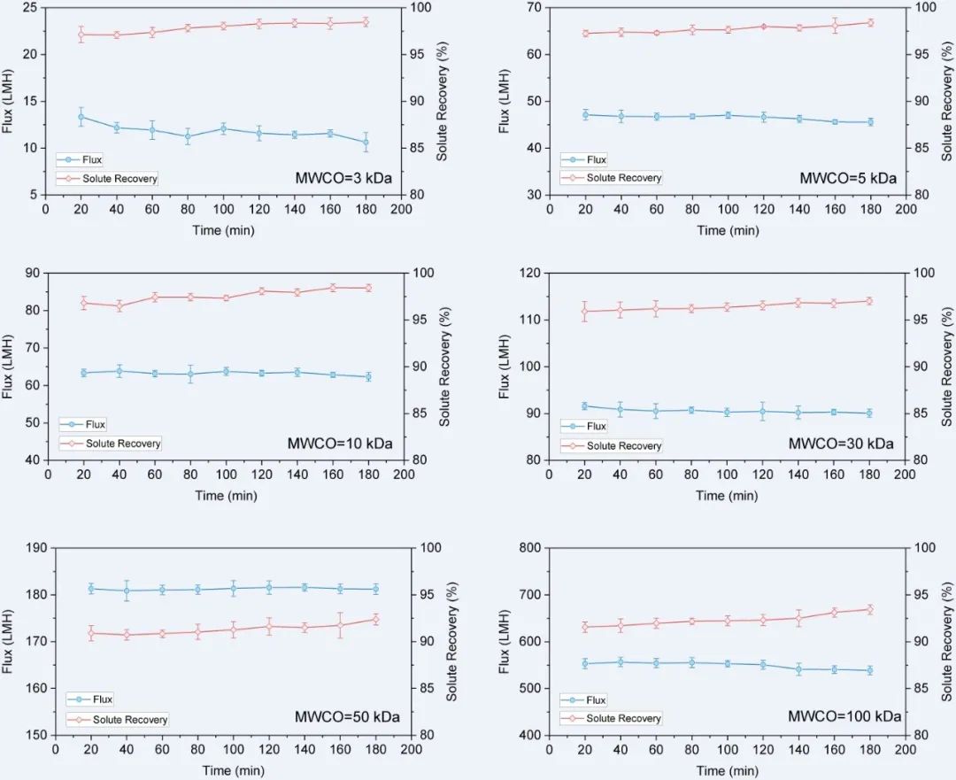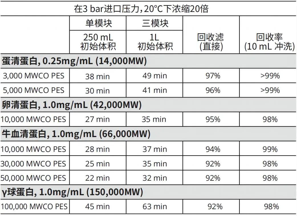 下面是我們配置了四種不同濃度的蛋白溶液包括蛋清蛋白, 0.25mg/mL (14,000MW)、卵清蛋白, 1.0mg/mL (42,000MW)、牛血清蛋白, 1.0mg/mL (66,000MW)、γ球蛋白, 1.0mg/mL (150,000MW)等,用我們不同分子截留的單模塊和三模塊的PRISM 50超濾膜包進行截留,實驗條件在3 bar進口壓力,20℃下濃縮20倍,其平均直接回收率在94%以上,在10mL沖洗的條件下平均回收率達到98%以上,其過程對純水的通量總體恢復非常穩定,沒有明顯的下降趨勢。