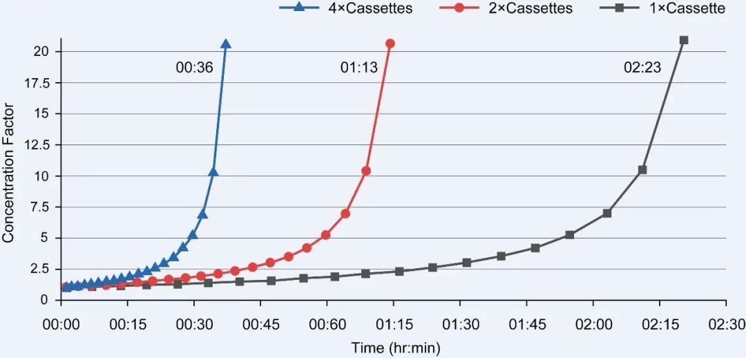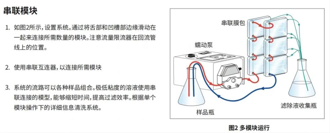 PRISM 50的模塊化設計使多個模塊串聯操作。這將最大吞吐量提高到3升,并與膜面積成比例地加快處理速度(見下圖)。
